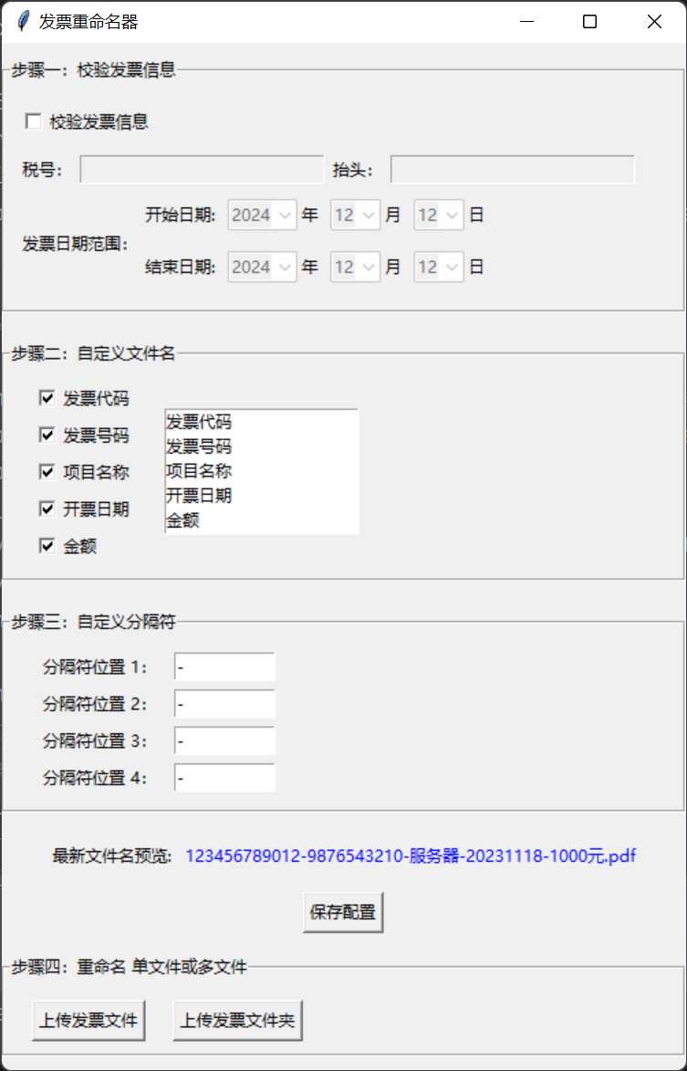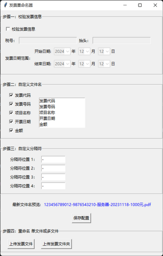 “发票重命名器”是一款基于 Python 的 GUI 应用程序,旨在帮助用户批量重命名发票文件。程序通过解析 PDF 格式的发票文件,自动提取发票号码、发票代码、项目名称、开票日期和金额等信息,并允许用户根据这些字段自定义文件名格式。